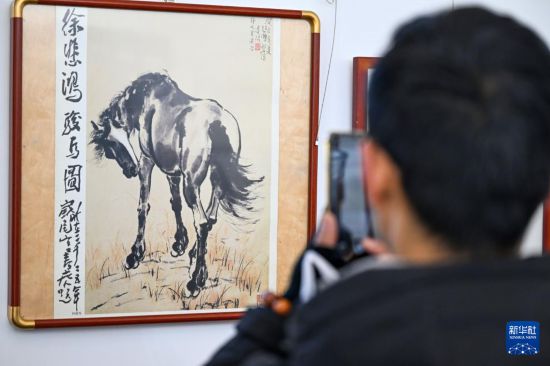 12月29日,游客参观在天津古文化街举办的“迎马年五朝马画展”。